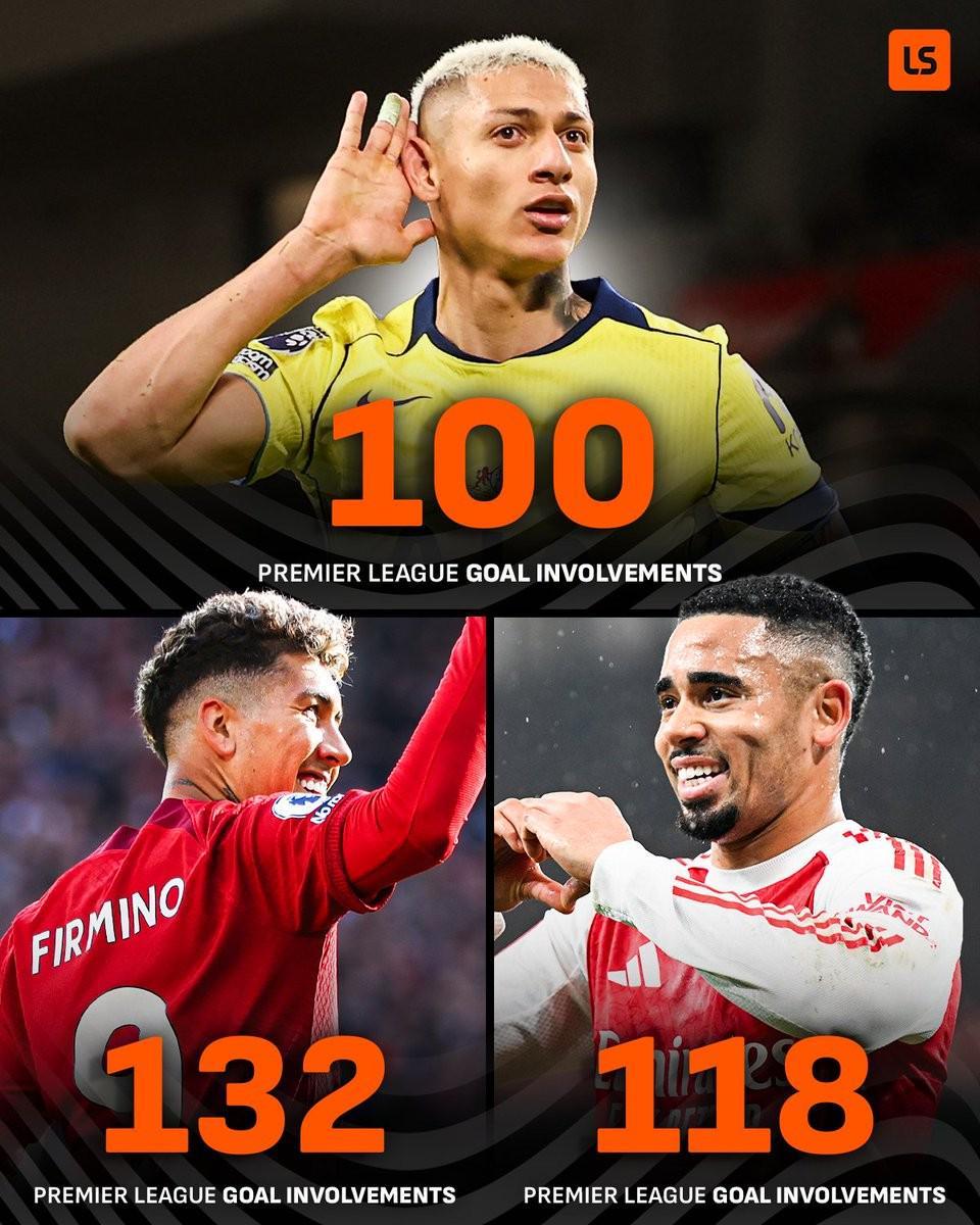 至此,里沙利松英超生涯268次出场已直接参与100球,包括73球27助(其中对阵利物浦参与6球3助为最多)。