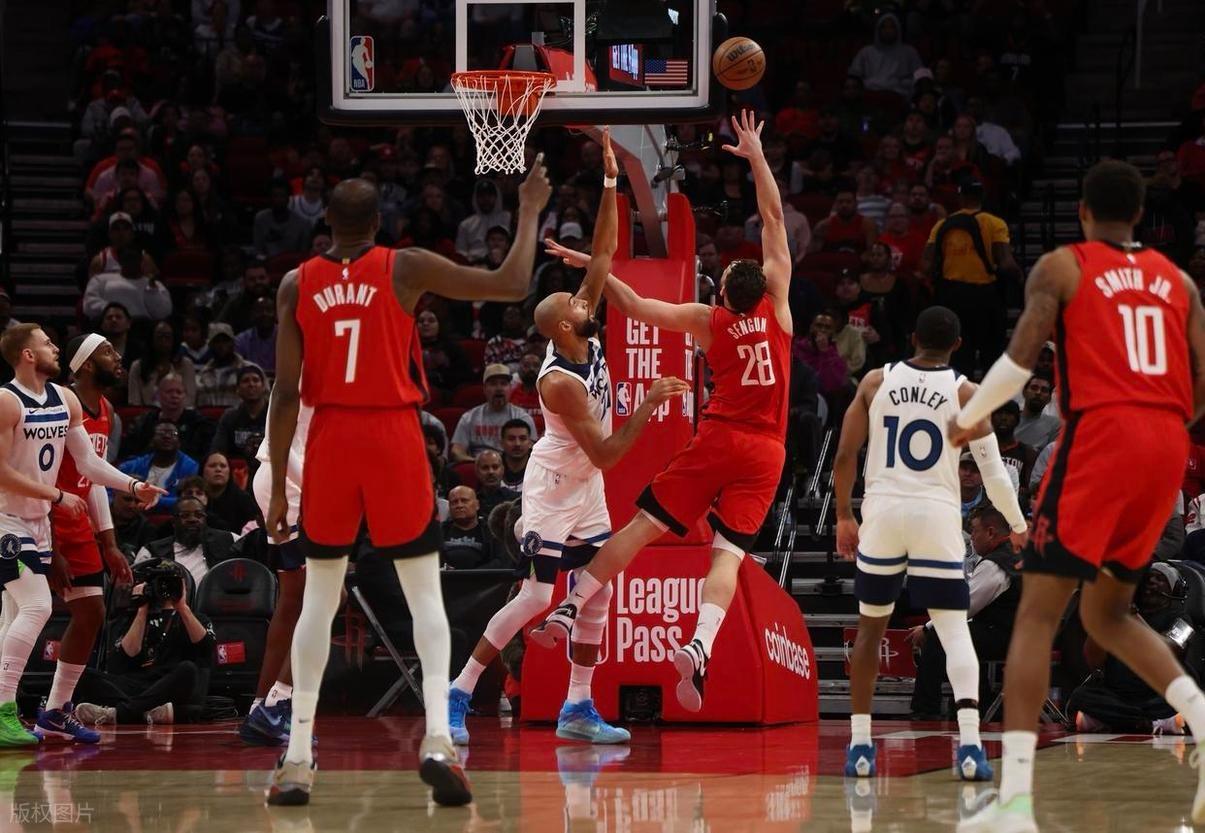 NBA常规赛,火箭坐镇主场迎击森林狼。本场比赛之前,火箭23胜15负排名西部第6,近段时间他们状态不佳,20分狂输雷霆就算了,还被开拓者双杀,打西部倒数的国王都打不过。最主要的原因,在于他们的投射完全崩盘,根据数据统计,火箭近7场三分命中率24.6%,NBA历史同时段最低,这个小球时代没有三分球怎么行,即使你拥有再好的身体天赋,没投射也是白给。此外,火箭还存在战术体系太单一,缺乏控球组织者等问题。另一边的森林狼,本场比赛之前,27胜14负排名西部第4,作为西部超级大黑马之一。